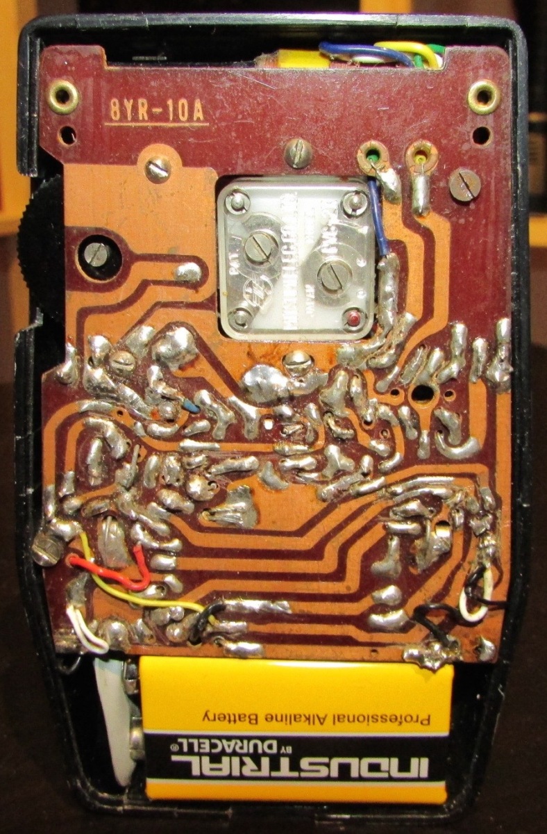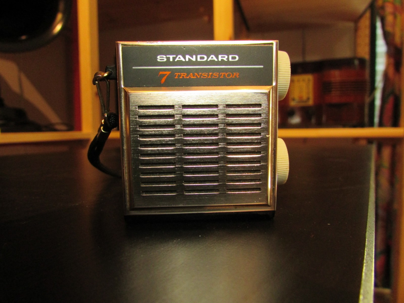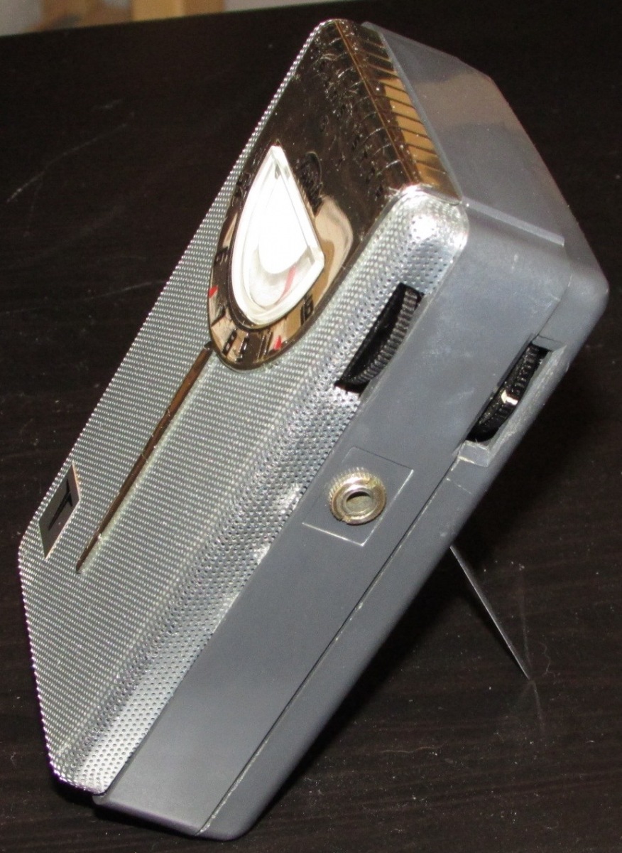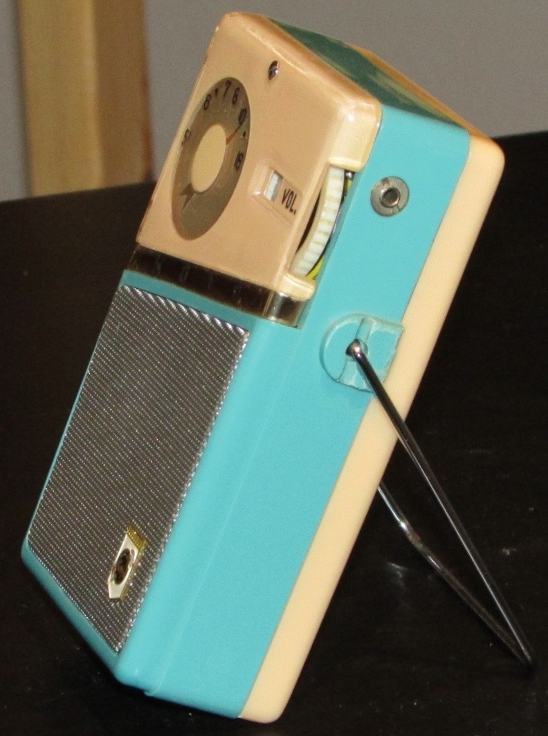 6 transistor radio produced in 1961, nicknamed “bathroom scale”. Dimensions 2.75 x 4.5 x 1.25 inch, broadcast band only. 9V battery power supply.