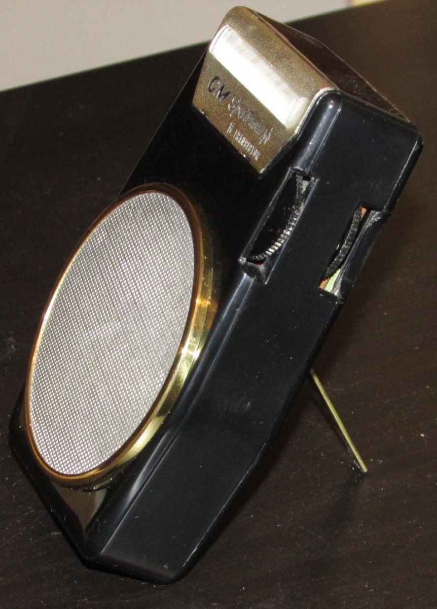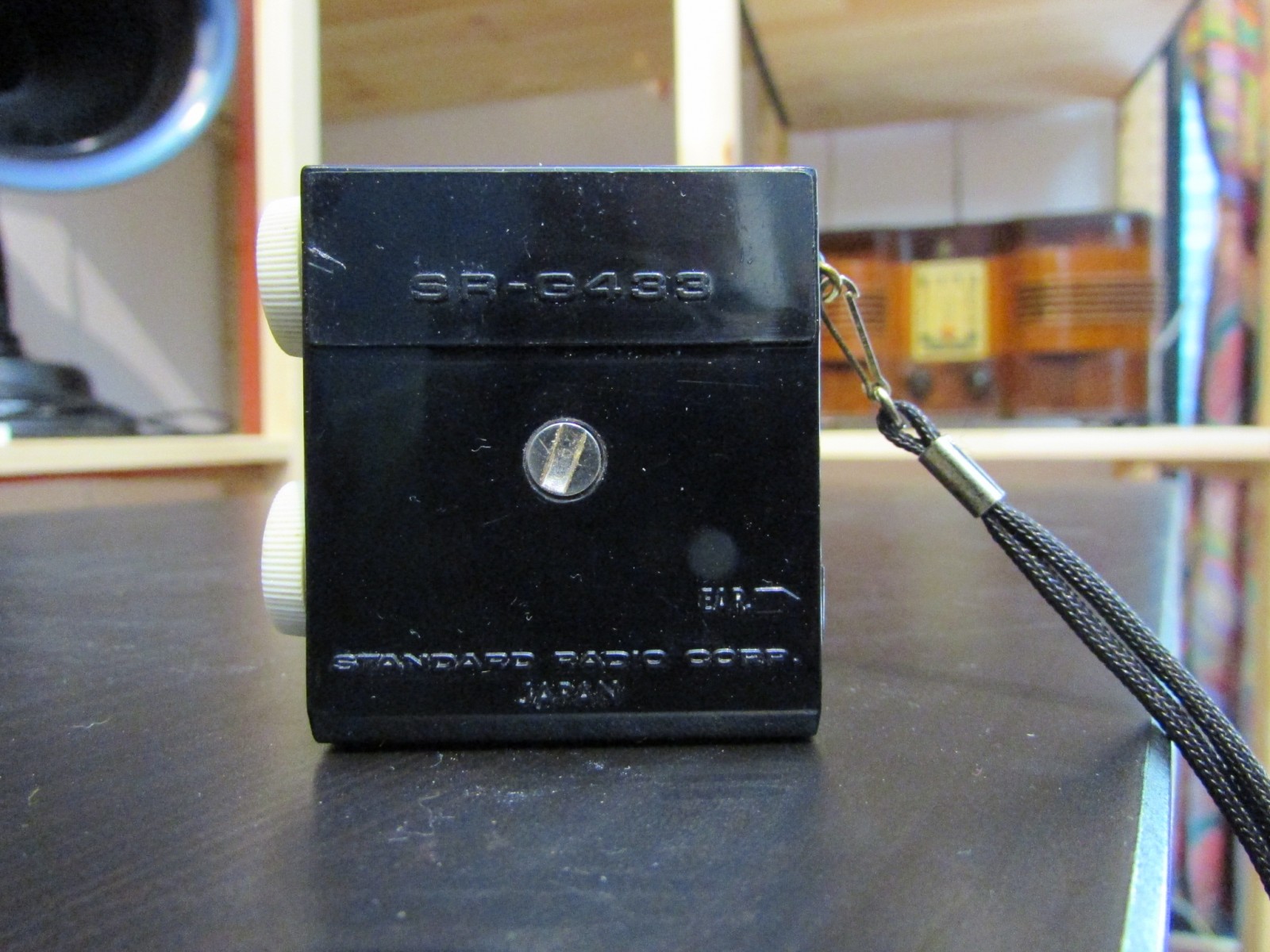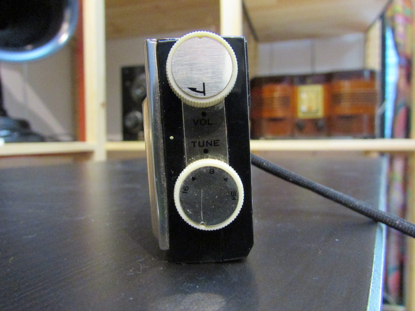 Manufactured in Japan in 1962, this unit was sold under the name “GM Sportsman”. Broadcast band only, dimensions 2.8 x 4.3 x 1.1 inch, 9V battery power supply.