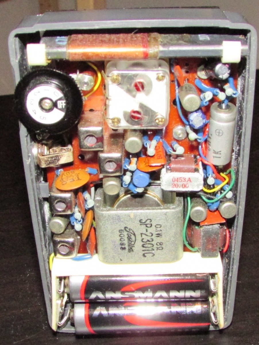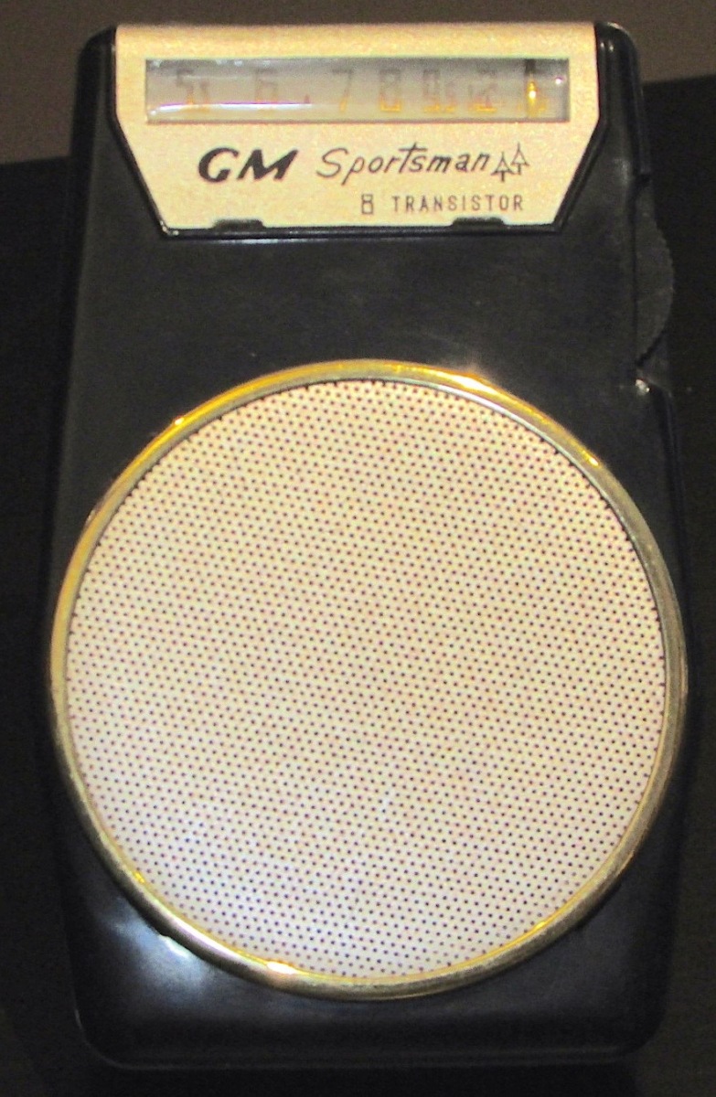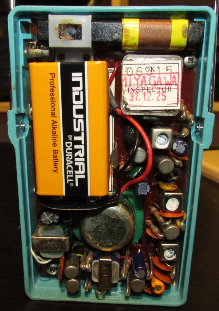 Manufactured in Japan in 1962, this unit was sold under the name “GM Sportsman”. Broadcast band only, dimensions 2.8 x 4.3 x 1.1 inch, 9V battery power supply.