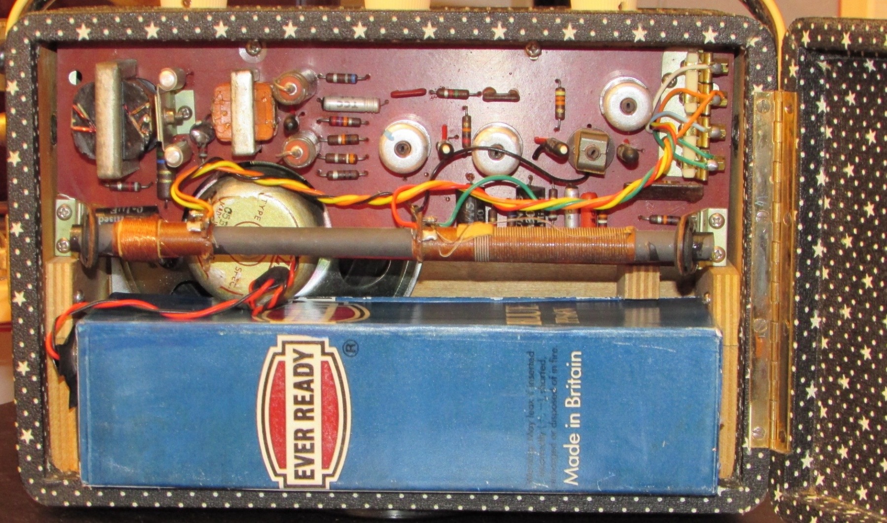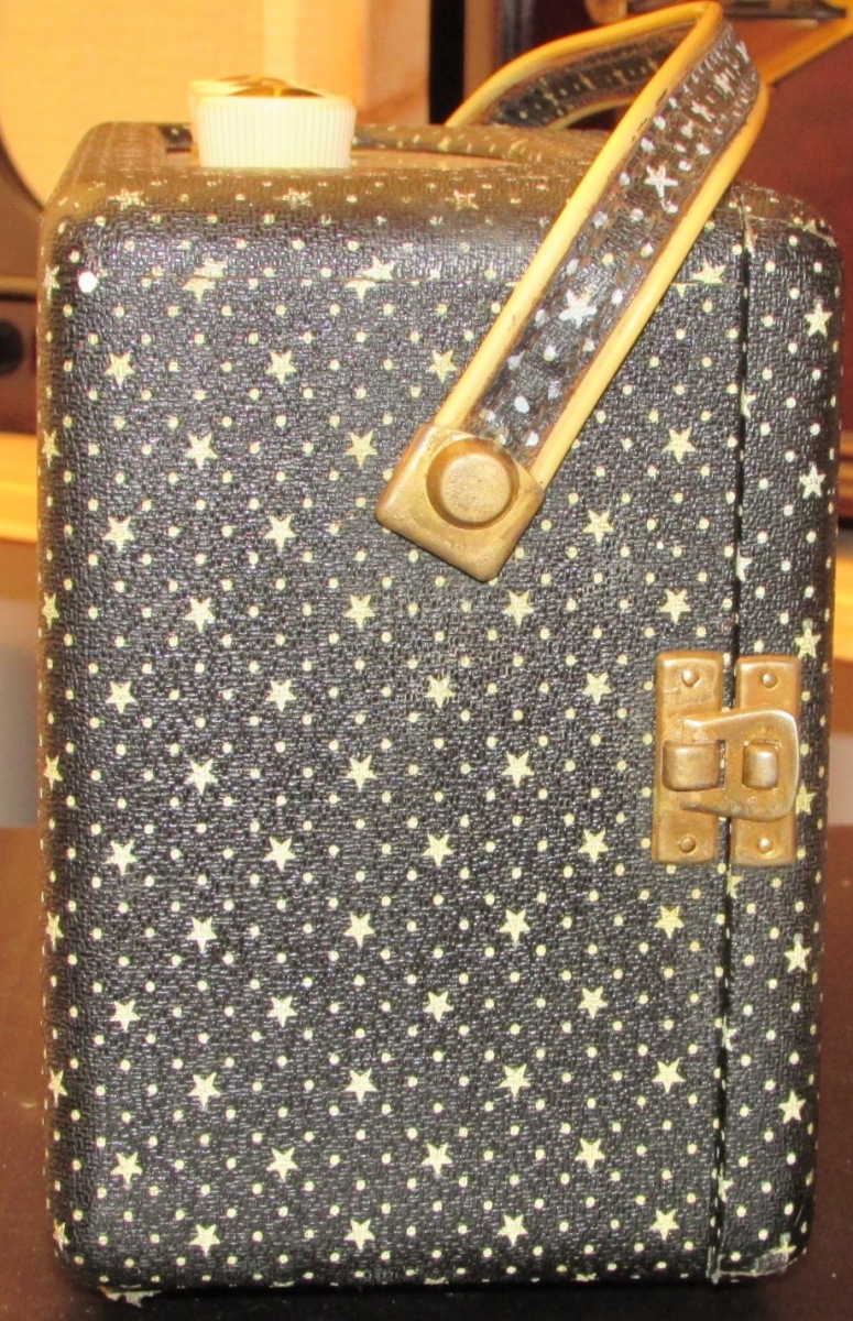 This is the first transistor radio produced by Roberts from 1958 to 1960. This is the sought after “Starry Night” version. 6 transistors, broadcast band and long waves. Dimensions 9.8 x 6.3 x 4.3 inch , weight 4 lb 6.5 oz.