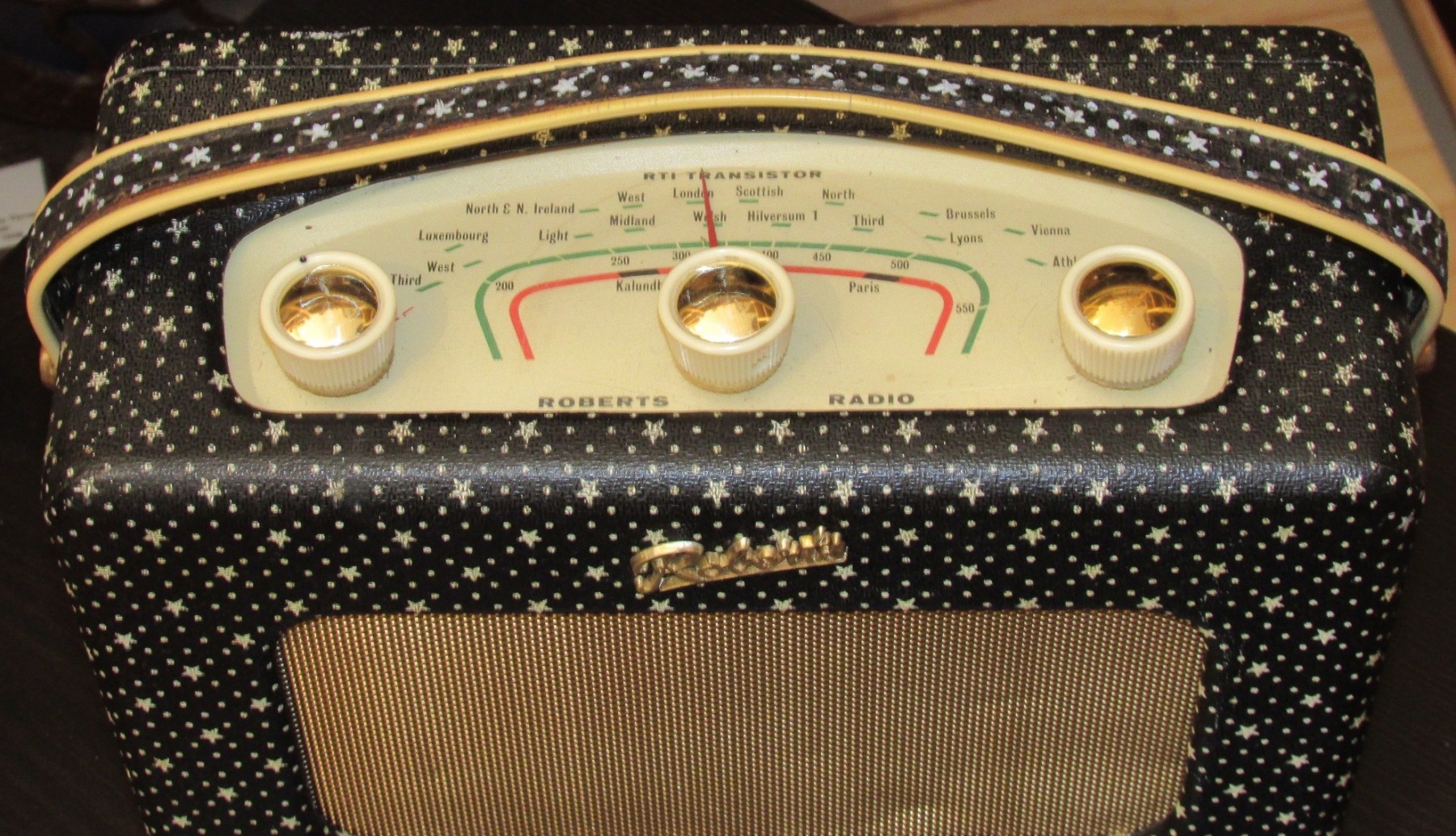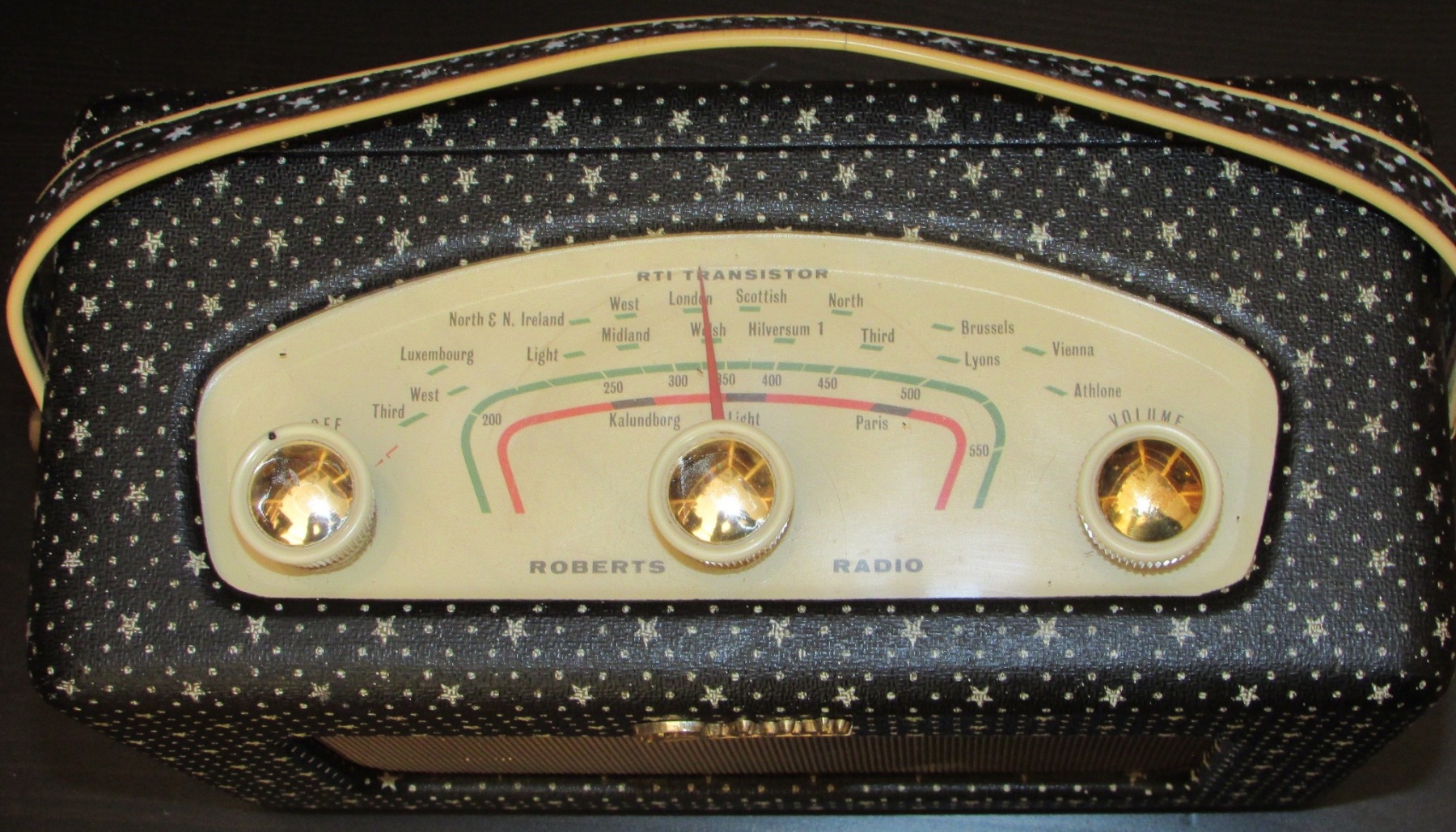 La prima radio a transistor prodotta dalla Roberts dal 1958 al 1960. Questa è la ricercata versione “Starry Night”. 6 transistor, onde medie e lunghe. Dimensioni 250 x 160 x 110 mm, peso 2 kg.